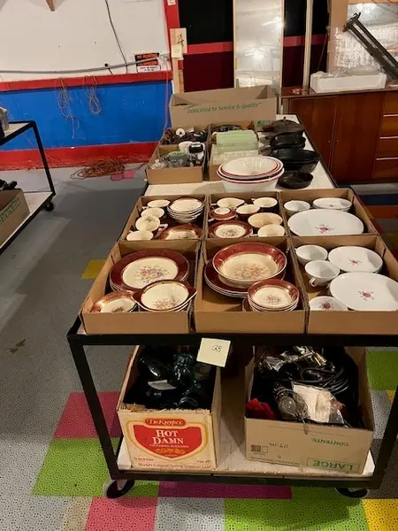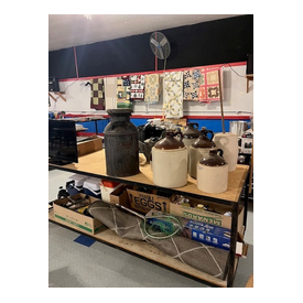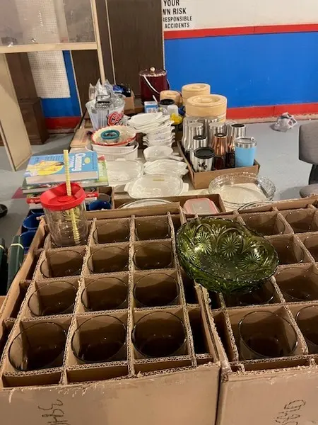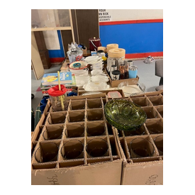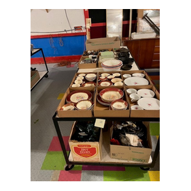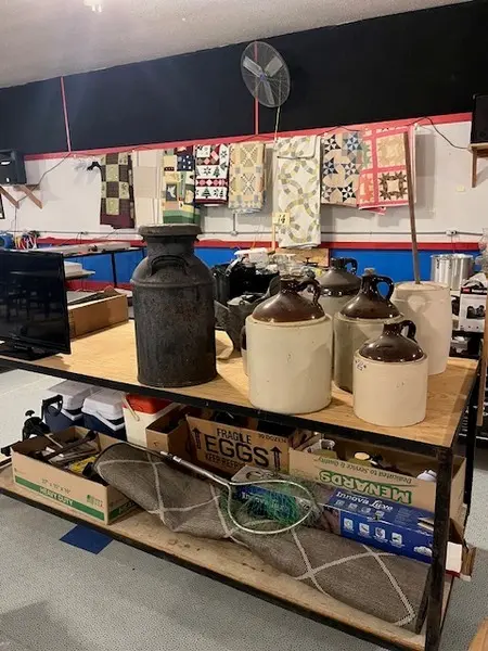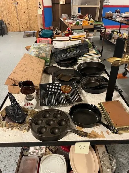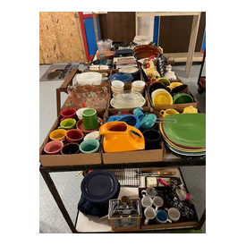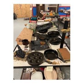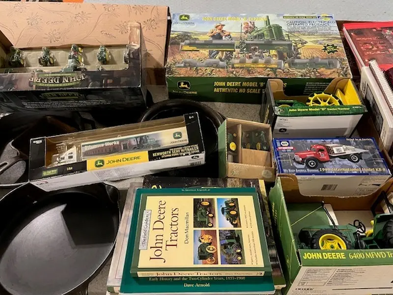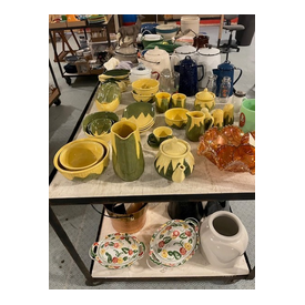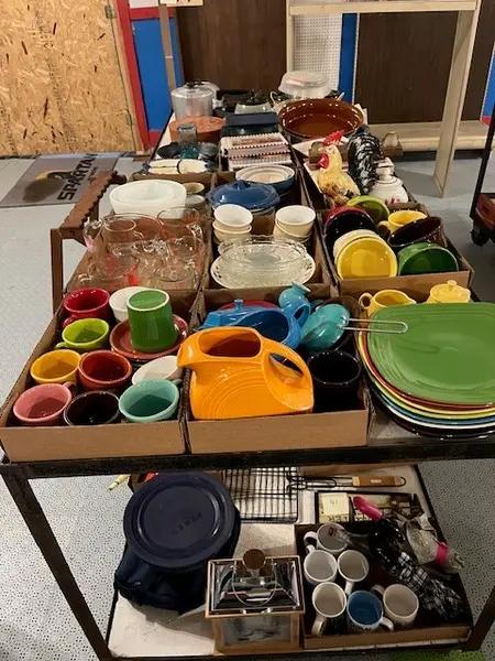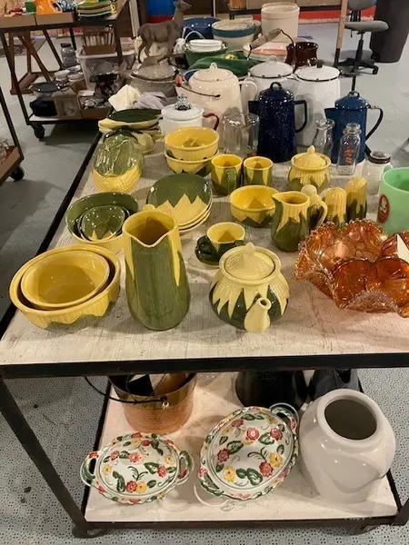 We have two nice estates of collectibles, glassware, crocks and cast iron. 20 pcs. Shawnee, Fiesta, Depression, cast iron including Griswold and Wagner, Pyrex, Corning ware, lots of cook books, 20 quilts, soft goods, John Deere toys, DVD’s, green fruit jars, 2 bikes, and lots more. WE have 20- 8’ tables full. Furniture: 3 pc bedroom set, extra chest, refrigerator, small chest freezer, office ice box, office desk & file cabinet, Oak dining table & 6 chairs, recliner, 7 pc. Lawn furniture, lots of yard tools, wheel barrels, 24’ ext. ladder, 8’ step ladder, large Halloween yard pcs. and more.